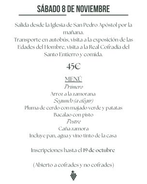 Transporte en autobús, visita a la exposición de las Edades del Hombre, visita a la Real Cofradía del Santo Entierro y comida.
