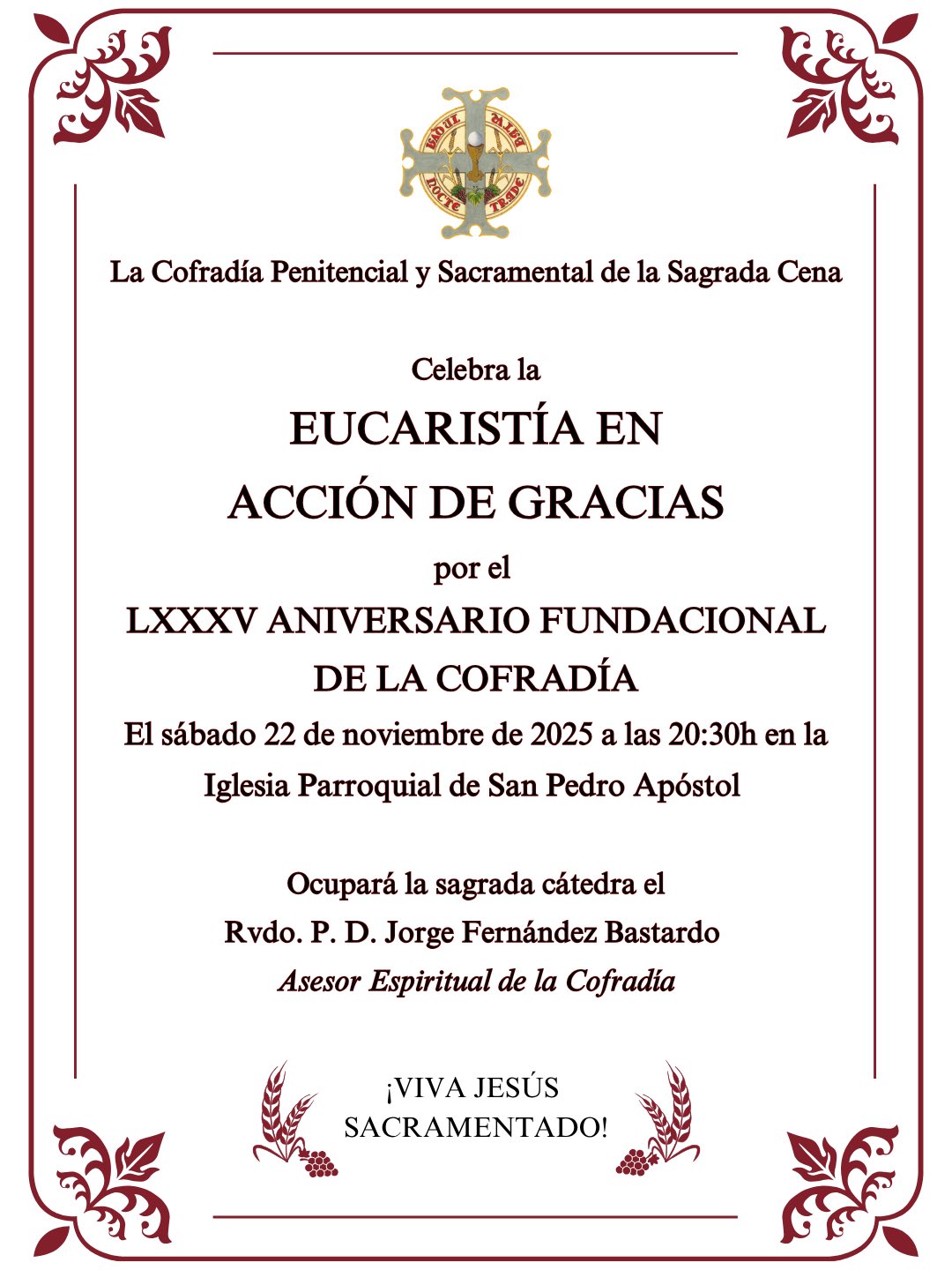El sábado 22 de noviembre de 2025 se celebrará la Solemne Eucaristía conmemorativa de la fundación de la cofradía, en este caso por nuestro octogésimo quinto anivesario, la Eucaristía se celebrará en nuestra sede, la Iglesia de San Pedro Apóstol a las 20:30 h.